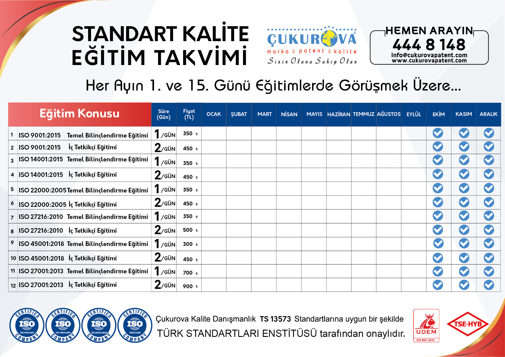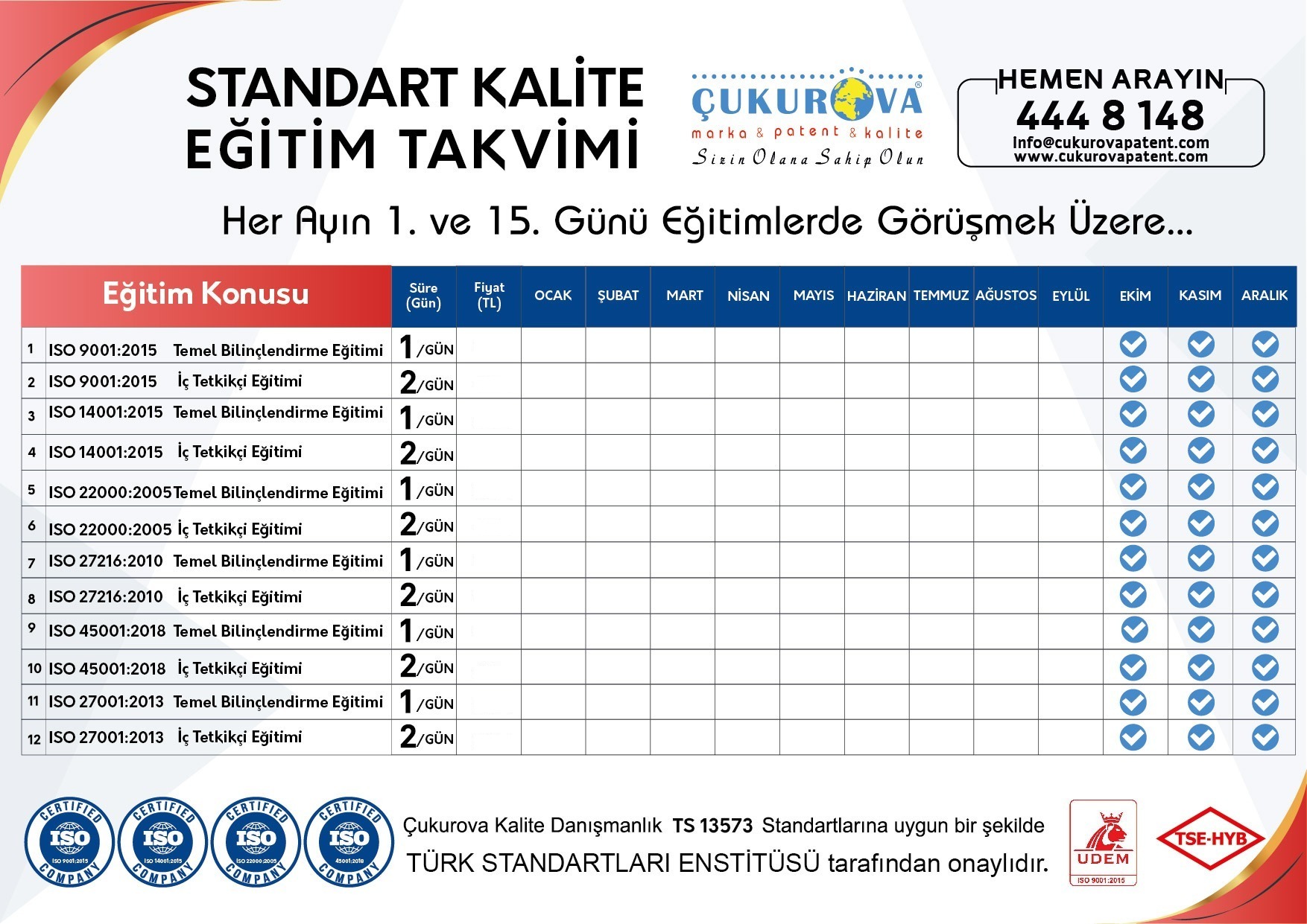 Hatay Marka Patent Kalite Yönetim ve Danışmanlık olarak, kalite ve yönetim sistemleri alanında uzmanlaşmak isteyen profesyonel kişiler için eğitim organizasyonları başlattık. Eğitimlerimiz, 31 Aralık 2025 tarihine kadar kampanyalı fiyatlarla, her ayın 1. ve 15. günlerinde düzenlenmektedir.